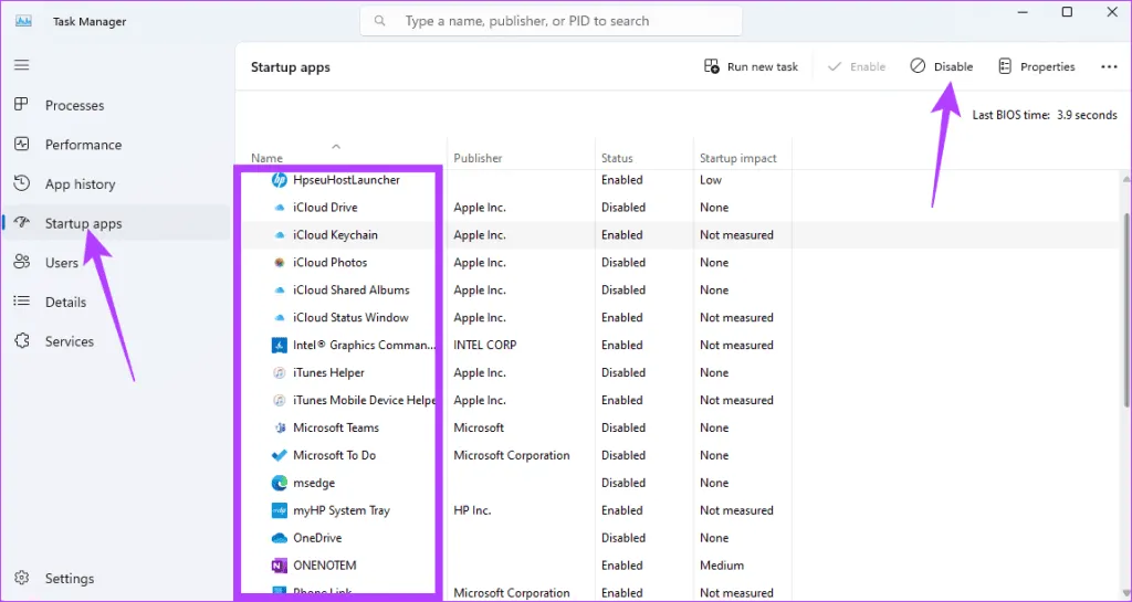 مرحله 3: به صورت اختیاری، روی منوی Startup Apps در سمت چپ کلیک کنید، روی هر برنامه راه اندازی فعال کلیک کنید و دکمه Disable را کلیک کنید..