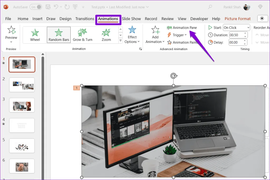 قبل از اینکه هر چیز دیگری را امتحان کنید، ایده خوبی است که مجموعه افکتها و محرکهای انیمیشن را در ارائه پاورپوینت خود بررسی کنید..در اینجا نحوه انجام این کار آمده است.<کارنکردن انیمیشن ها> مرحله 1: ارائه پاورپوینت خود را باز کنید، به تب Animations در بالا بروید و گزینه Animation Pane را از گروه Advanced Animation انتخاب کنید..