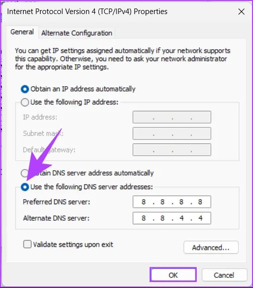 مرحله 6:.آدرسهای DNS اولیه و ثانویه را به ترتیب در قسمتهای Preferred DNS Server و Alternate DNS Server وارد کنید..توجه: ما با.8.8.8.8.4.4.مرحله 7:.