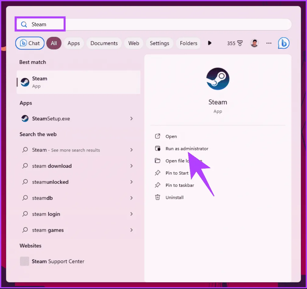 این یکی از رایج ترین دلایلی است که نمی توانید به فروشگاه Steam دسترسی پیدا کنید.برای اجرای Steam به عنوان ادمین مراحل زیر را دنبال کنید. خطا107 مرحله 1: کلید Windows را روی صفحه کلید خود فشار دهید و تایپ کنید .مرحله 2: اکنون روی Run as administrator کلیک کنید.'.