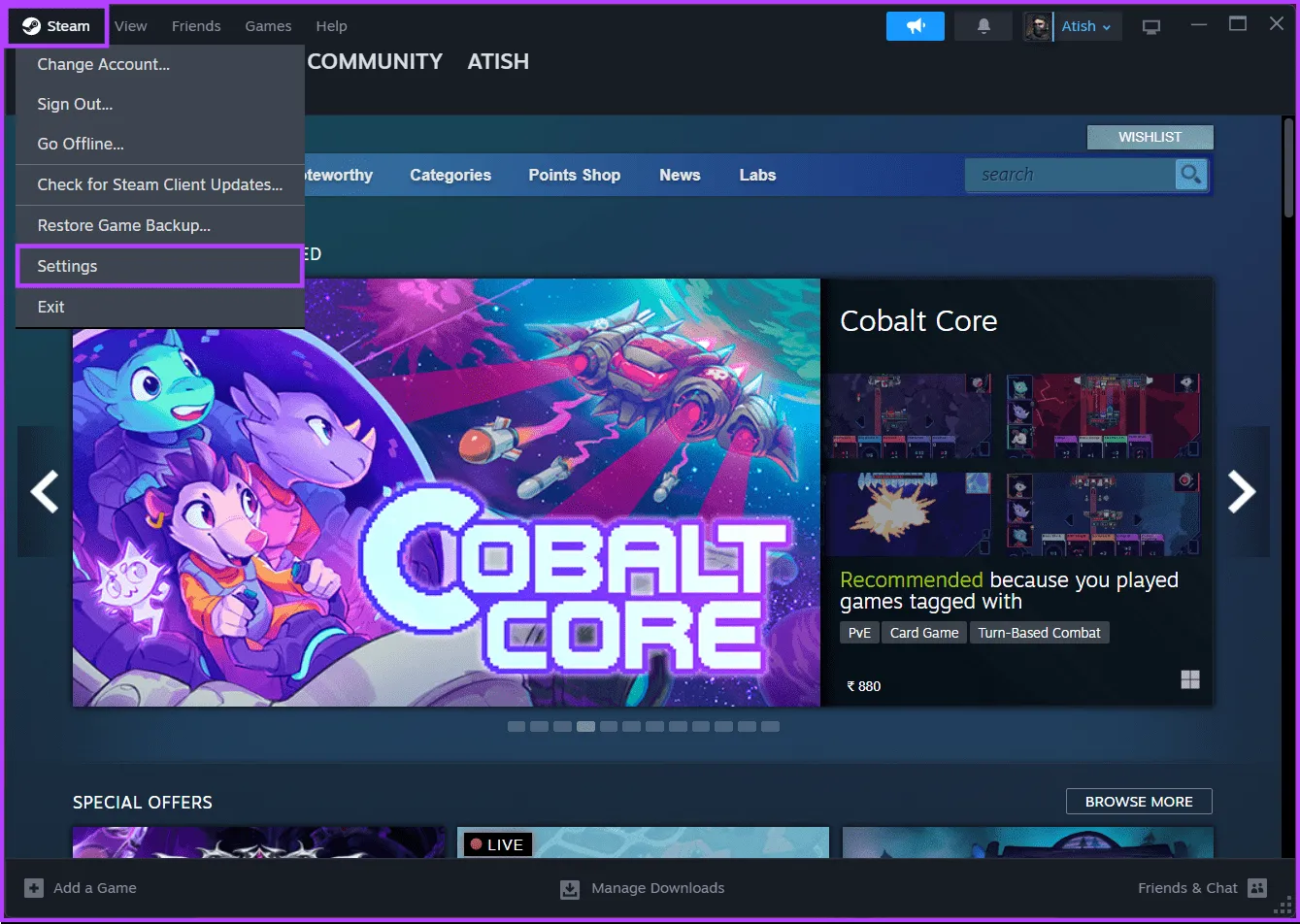گاهی اوقات، کش مرورگر خراب می شود و کد خطای Steam 107 را فعال می کند..این ممکن است به این دلیل باشد که صفحه فروشگاه از مرورگر وب داخلی Steam برای بارگیری داده ها استفاده می کند خطا107 .مرحله 1 :سرویس گیرنده Steam را راه اندازی کنید.روی Steam در گوشه بالا سمت چپ کلیک کنید و از منوی کشویی، تنظیمات را انتخاب کنید.
