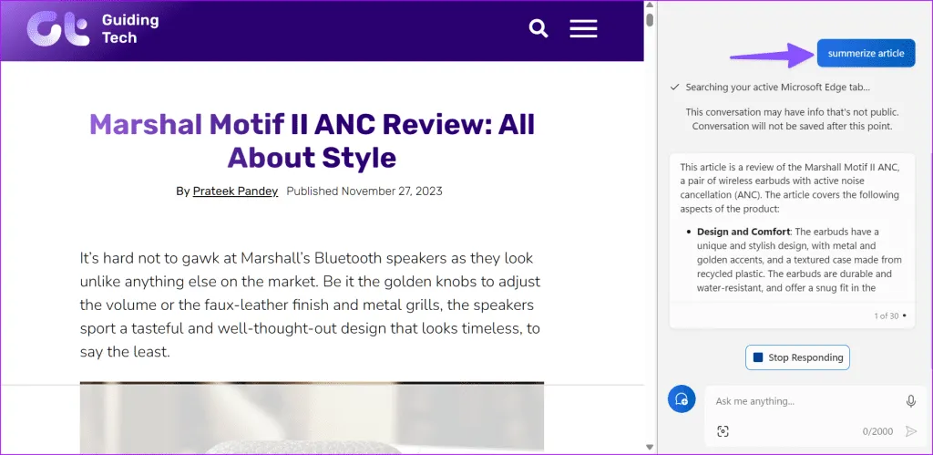 به طور پیش فرض، Microsoft Copilot می تواند تب فعال Microsoft Edge شما را بخواند.به این ترتیب، می تواند پاسخ های مرتبط تری را در اختیار شما قرار دهد.اگر نمیخواهید یک مقاله کامل بخوانید، میتوانید میانبر صفحه کلید Windows C را بزنید تا Copilot راهاندازی شود و از آن بخواهید پست را خلاصه کند..