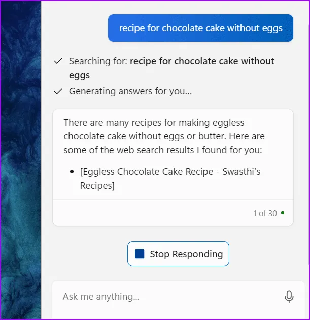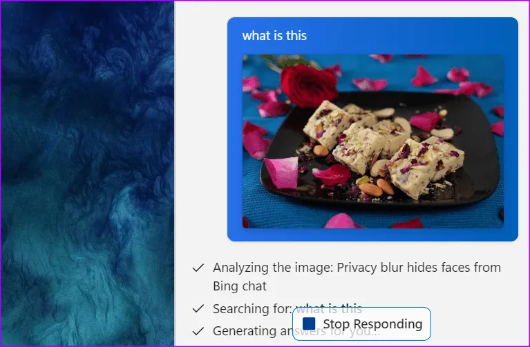 Copilot تصویر آپلود شده شما را شناسایی می کند و پاسخ مربوطه را نشان می دهد.ما تصویری از شیرینی هندی را آپلود کردیم و Copilot آن را به طور دقیق توصیف کرد و دستور پخت را نشان داد.