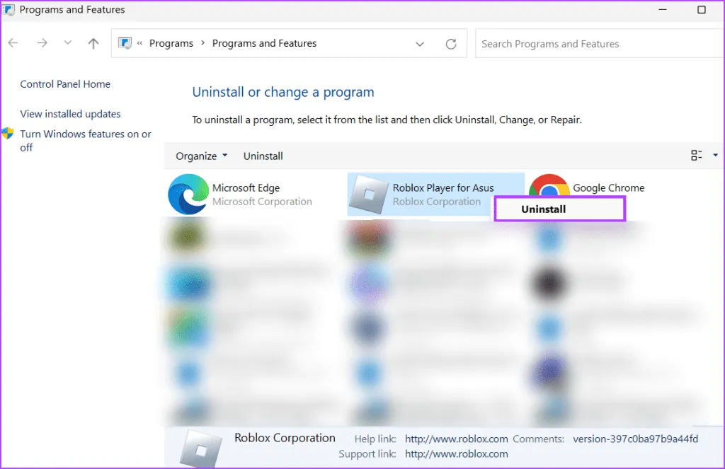 مرحله 2: Roblox Player را در لیست برنامه های نصب شده پیدا کنید.روی آن راست کلیک کرده و گزینه Uninstall را انتخاب کنید.