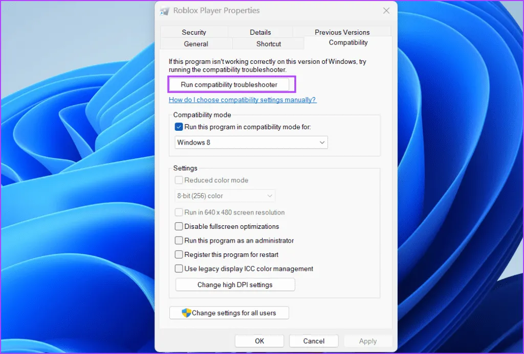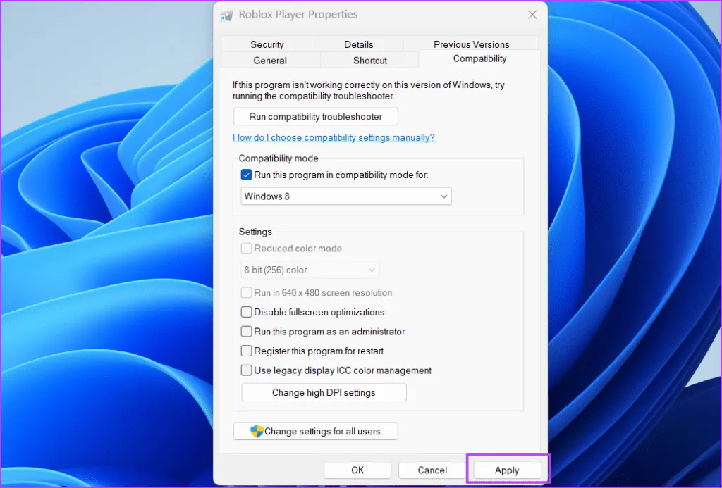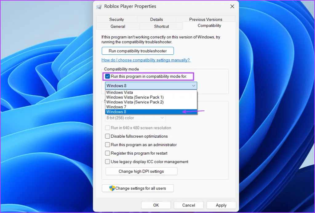 2.تنظیمات سازگاری Roblox را تغییر دهید.