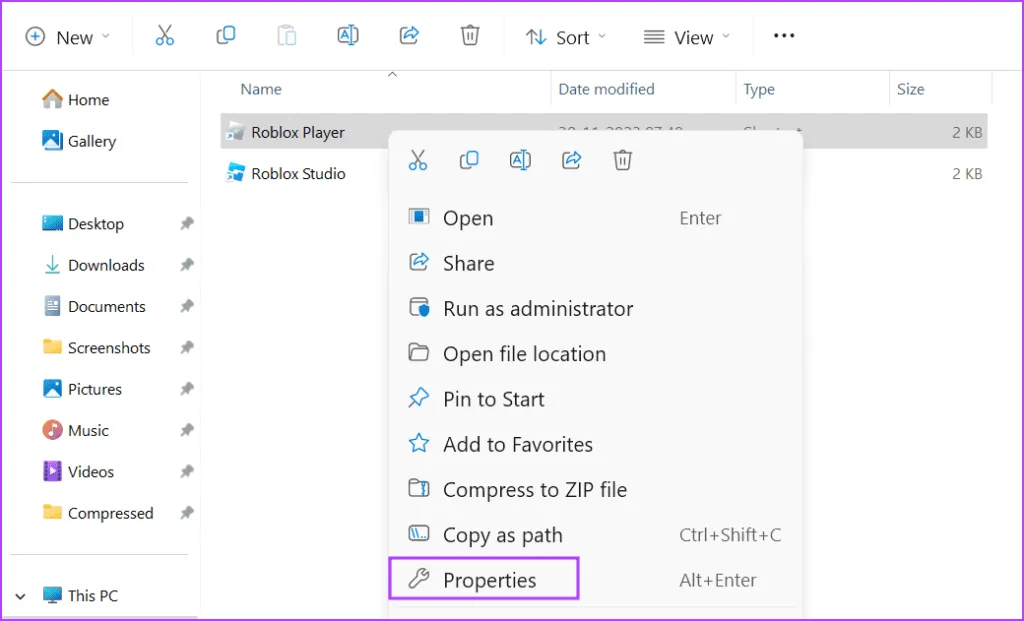 مرحله 1: روی نماد میانبر Roblox Player کلیک راست کنید تا منوی زمینه باز شود.روی گزینه Properties کلیک کنید.