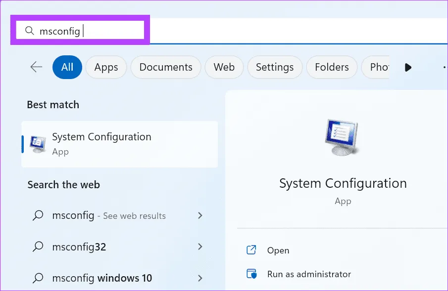 Clean Boot می تواند به شما کمک کند سرویس های متعلق به برنامه های شخص ثالث را که باعث خطای BSOD می شوند حذف کنید. مرحله1 msconfig را در نوار جستجو تایپ کنید و Enter را فشار دهید.
