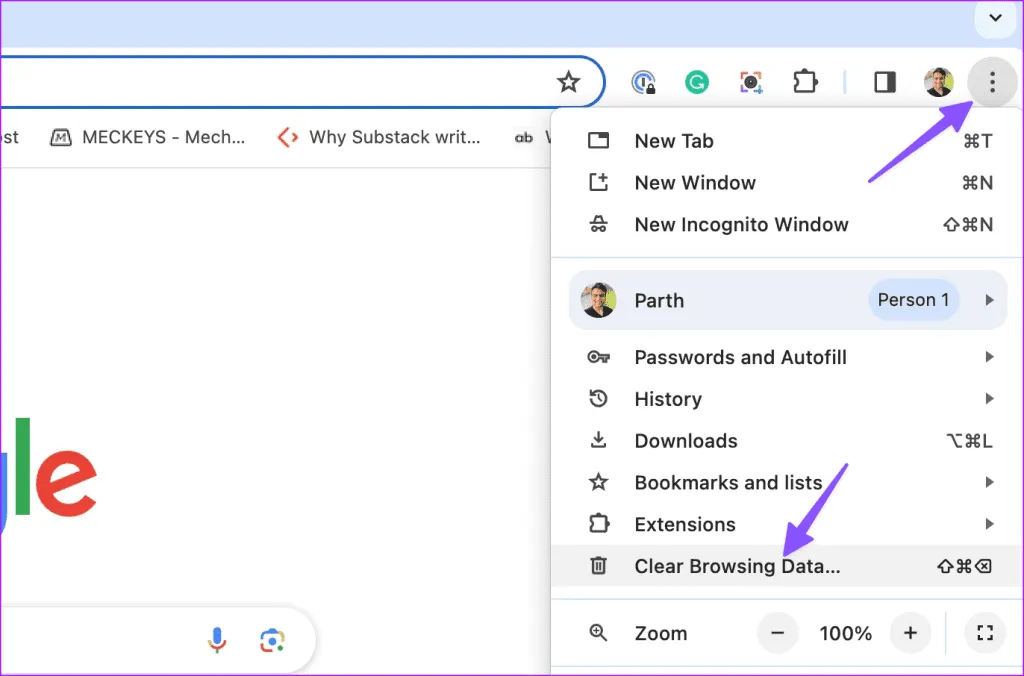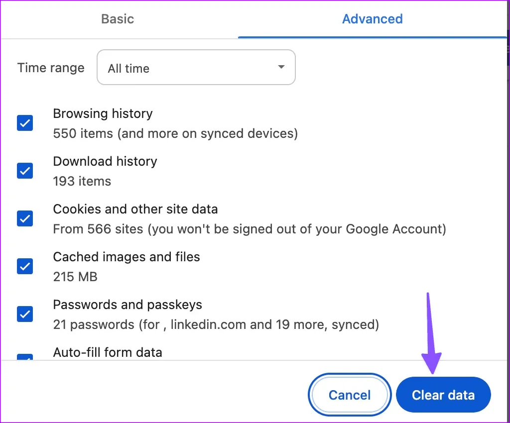Google Chrome حافظه پنهان را در پس زمینه جمعآوری میکند تا تاریخچه جستجو و جزئیات ورود شما را ذخیره کند و عملکرد کلی برنامه را بهبود بخشد.هنگامی که مرورگر حافظه پنهان برنامه خراب را جمع آوری می کند، ممکن است در بارگیری تصاویر با مشکلاتی مواجه شوید.باید کش گوگل کروم را پاک کنید و دوباره امتحان کنید. مرحله 1: Chrome را راه اندازی کنید و روی منوی سه نقطه کلیک کنید. مرحله 2: Clear browsing data را انتخاب کرده و به Advanced بروید.