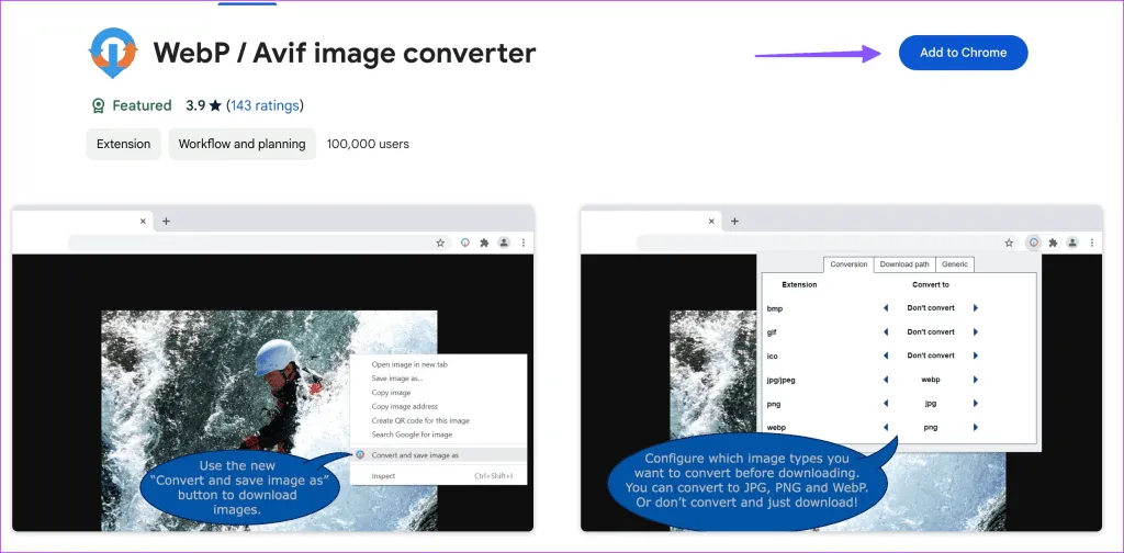 برخی از وب سایت ها از فرمت WebP برای صرفه جویی در فضای سرور بدون تأثیر بر کیفیت تصویر استفاده می کنند.به این ترتیب، برنامه نمایشگر تصویر پیش فرض روی دسکتاپ شما ممکن است با باز کردن تصاویر WebP با مشکلاتی مواجه شود.برای دانلود تصاویر WebP با فرمت های جهانی مانند JPEG یا PNG یا برای رفع مشکل ذخیره تصایر کروم باید از یک برنامه نمایشگر عکس شخص ثالث استفاده کنید یا ترفند زیر را امتحان کنید. .مرحله 1: به فروشگاه وب Google Chrome بروید و برنامه افزودنی مبدل تصویر WebP/Avif را جستجو کنید. مرحله 2: برنامه افزودنی را نصب کنید و به یک صفحه وب بروید.