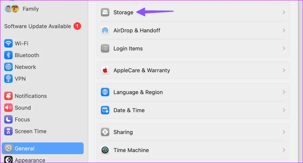 مرحله 2: به قسمت عمومی بروید و Storage را انتخاب کنید.