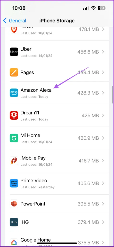 مرحله 2: به حافظه آیفون بروید و Amazon Alexa را انتخاب کنید.