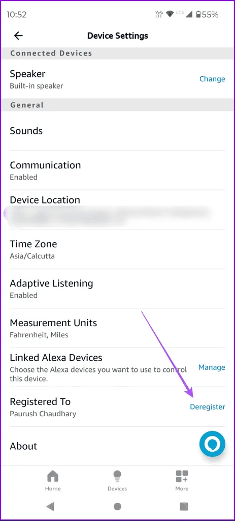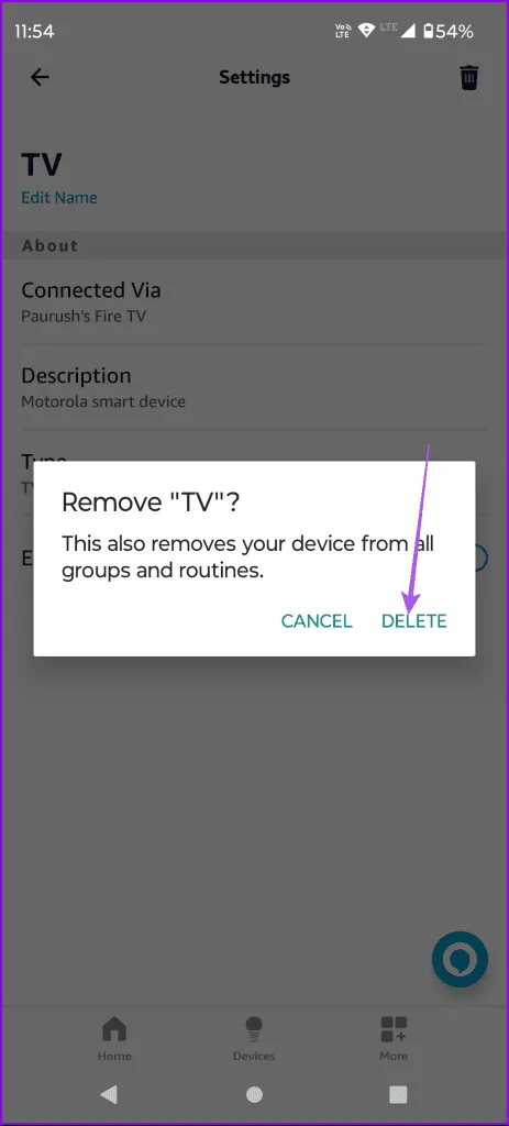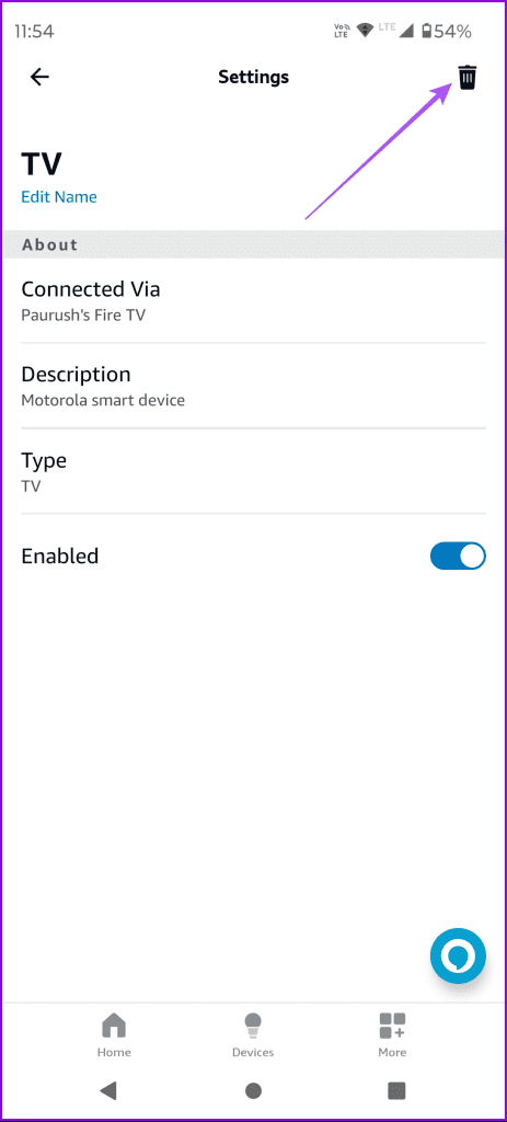 اگر هر یک از دستگاه های متصل شما با استفاده از برنامه الکسا به دستورات صوتی پاسخ نمی دهد، می توانید دوباره دستگاه را به حساب خود اضافه کنید..مراحل برای هر دو گوشی آیفون و اندروید یکسان است. مرحله 1: برنامه الکسا را \u200b\u200bدر آیفون یا گوشی اندرویدی خود باز کنید. مرحله 2: روی Devices در پایین ضربه بزنید و دستگاهی را انتخاب کنید.