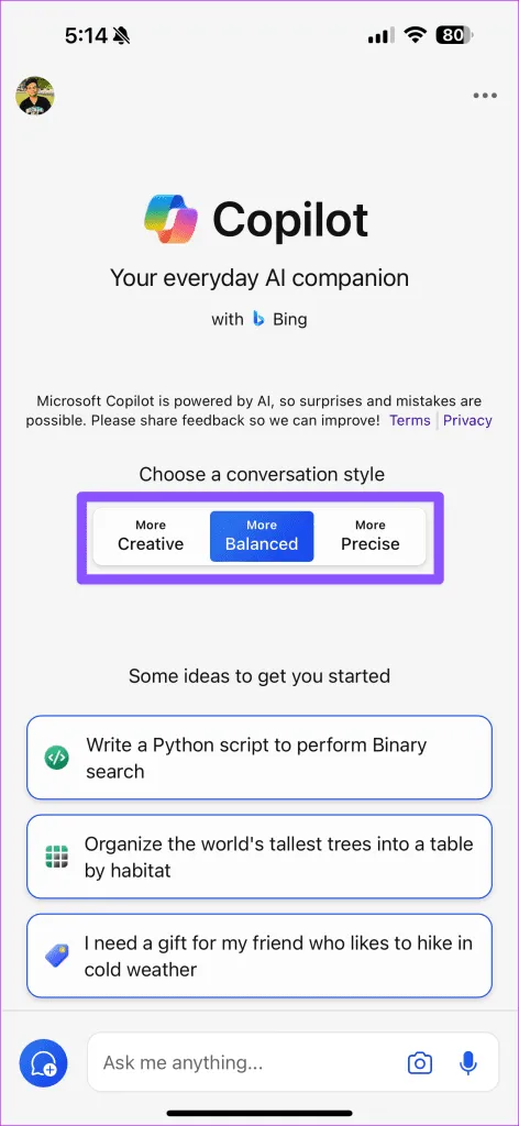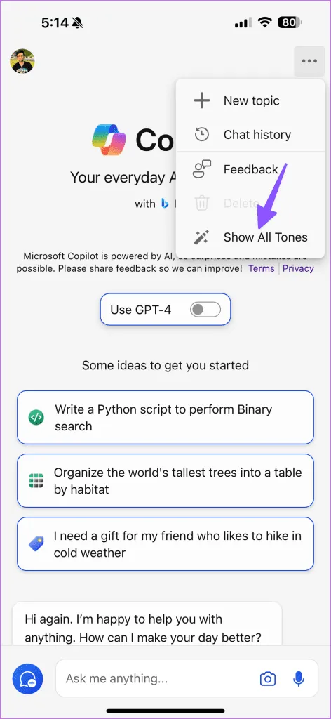 سبک مکالمه پیش فرض در Copilot متعادل تنظیم شده است.همانطور که از نام آن پیداست، ضمن ایجاد پاسخ به سوالات شما، بین خلاقیت و دقت تعادل برقرار می کند..میتوانید بر اساس اولویت خود به Creative یا Precise بروید .مرحله 1: Microsoft Copilot را راه اندازی کنید و روی منوی سه نقطه در گوشه سمت راست بالا ضربه بزنید. مرحله 2: روی Show All Tones ضربه بزنید.مرحله 3: روی More Creative یا More Precise از دستور زیر ضربه بزنید.