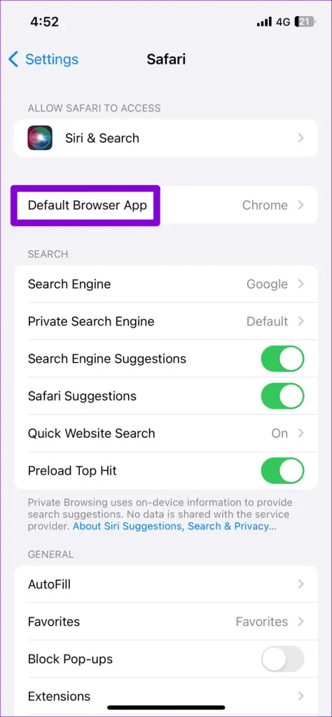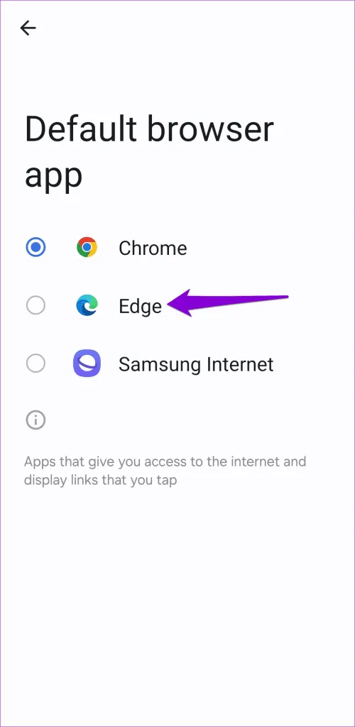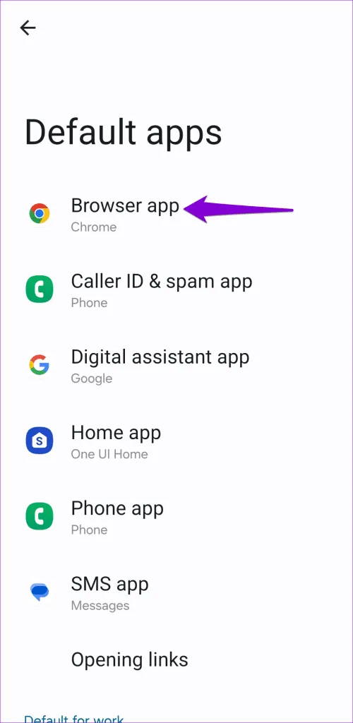 مرحله 2: روی Default Browser App ضربه بزنید و مرورگر مورد نظر خود را انتخاب کنید تا آن را به عنوان گزینه پیش فرض تنظیم کنید.