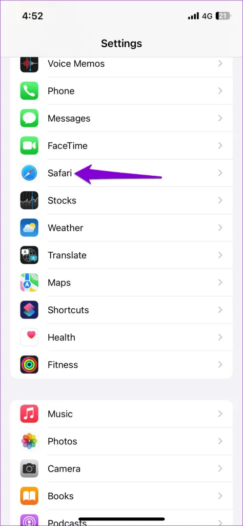 مرحله 1: برنامه تنظیمات را باز کنید و روی Safari ضربه بزنید.