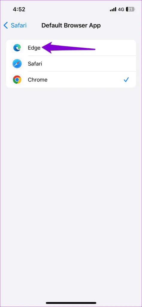 مرحله 2: روی برنامه Browser ضربه بزنید و مرورگری را که می خواهید به عنوان پیش فرض تنظیم کنید از منوی زیر انتخاب کنید.