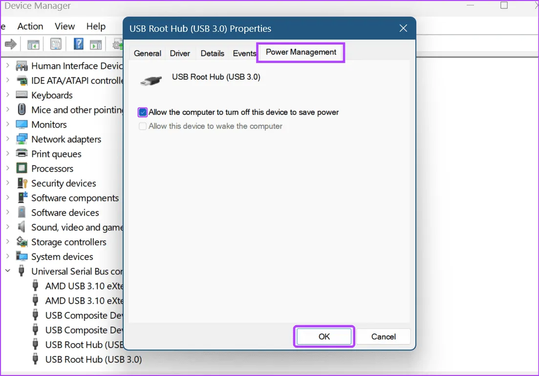 مرحله 5: به گزینه های منو بروید و روی Power Management در بالا کلیک کنید. مرحله 6: در اینجا تیک علامت را بردارید.پس از اتمام، بر روی OK کلیک کنید.